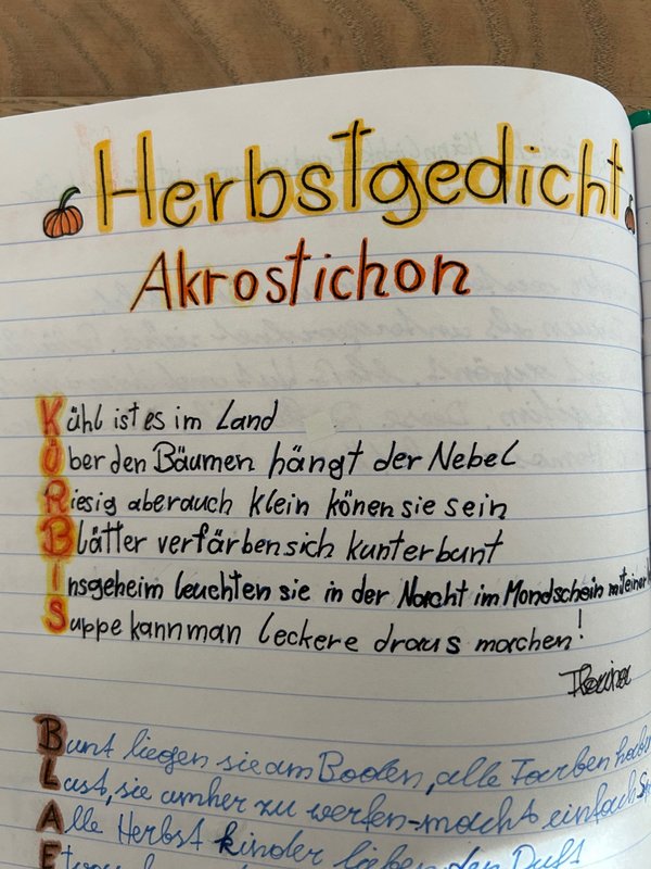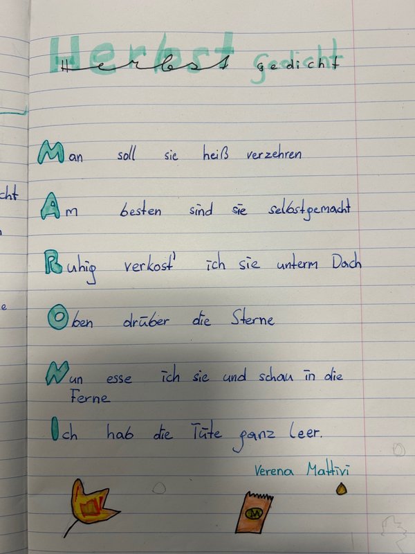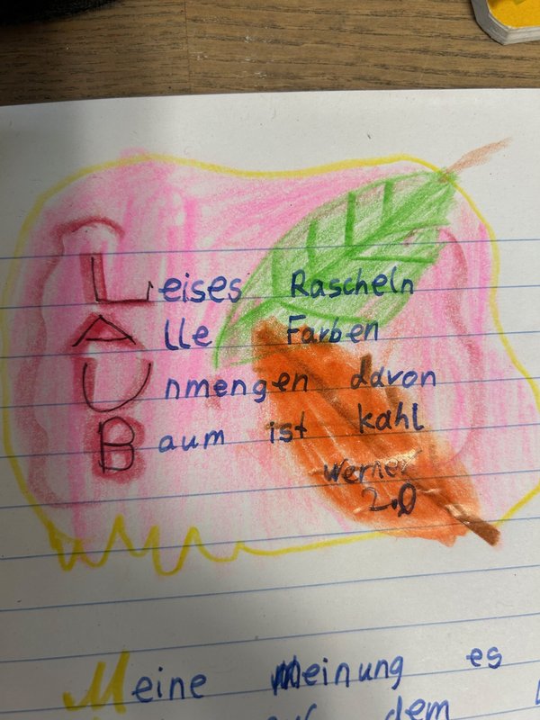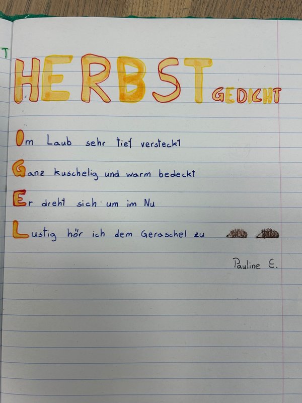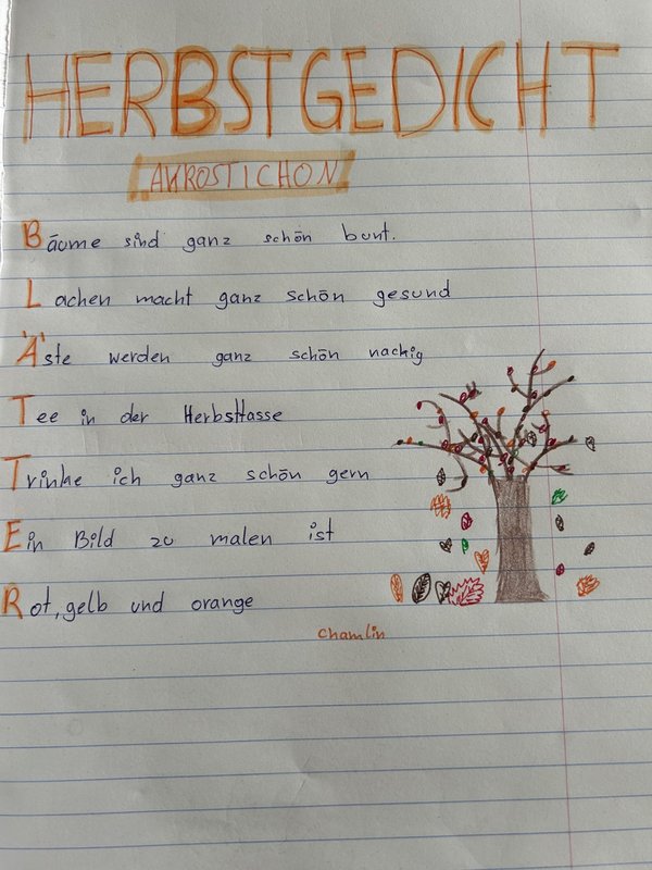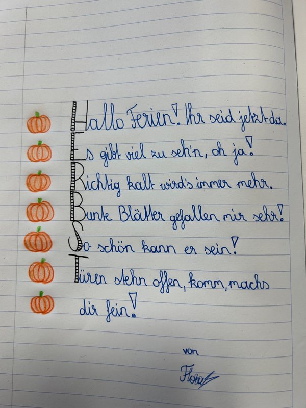 Die Schüler:innen der 3a und 3b haben um die Zeit der Herbstferien ihrer Phantasie freien Lauf gelassen und Gedichte geschrieben. Die Form ihrer Gedichte ist das Akrostichon, bei dem das Thema des Gedichtes (= 1 Wort) untereinandergeschrieben wird. Mit diesen Buchstaben beginnend werden mehr oder weniger poetische Sätze zum Thema gebildet.