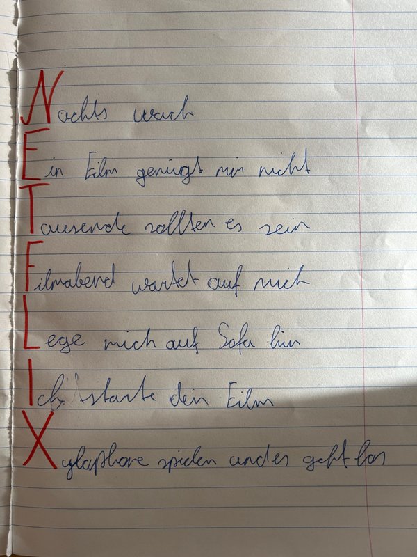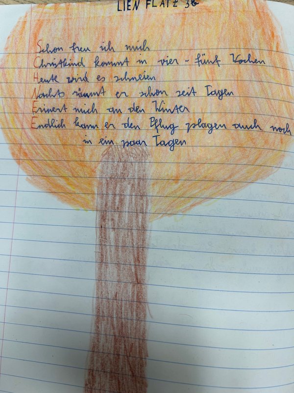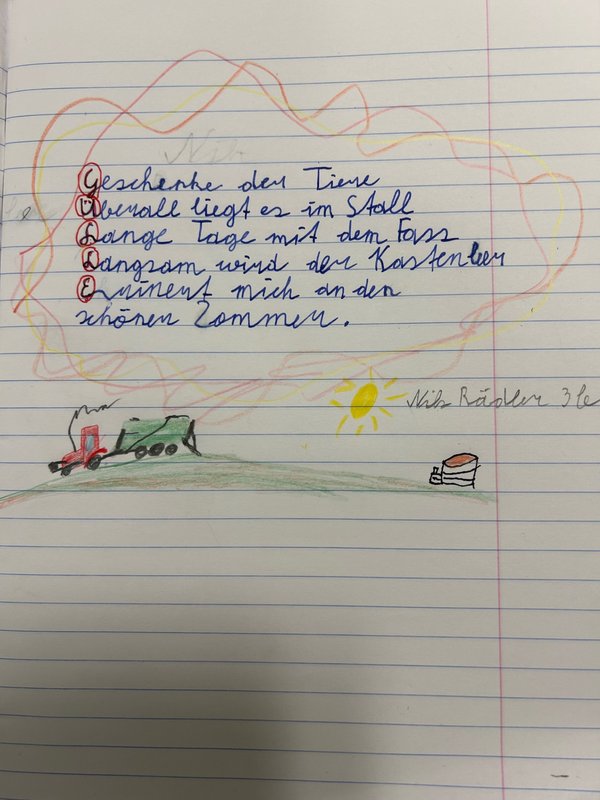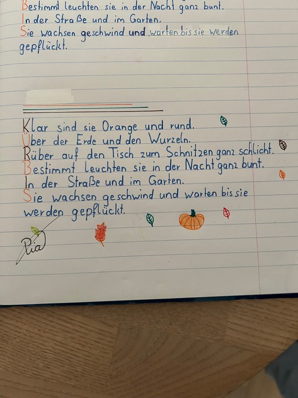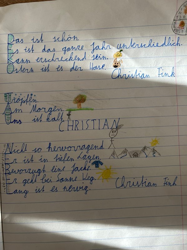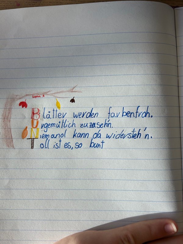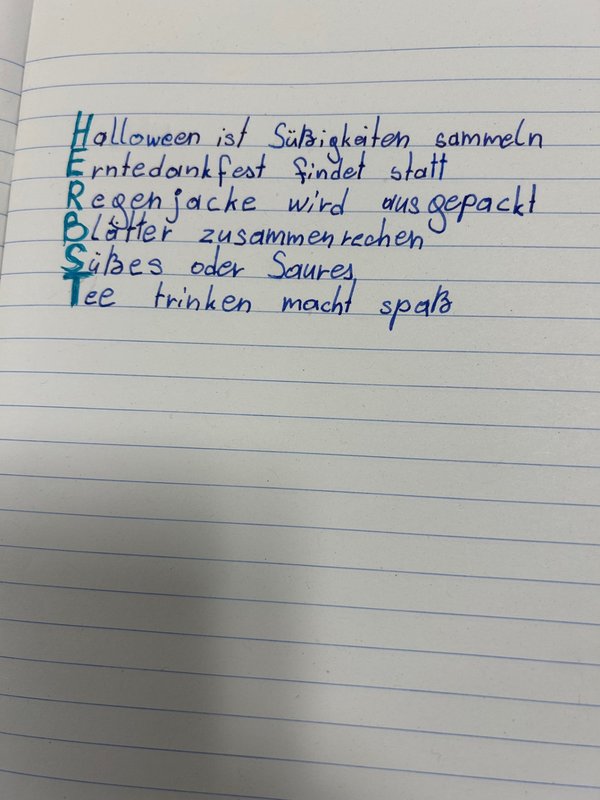 Die Schüler:innen der 3a und 3b haben um die Zeit der Herbstferien ihrer Phantasie freien Lauf gelassen und Gedichte geschrieben. Die Form ihrer Gedichte ist das Akrostichon, bei dem das Thema des Gedichtes (= 1 Wort) untereinandergeschrieben wird. Mit diesen Buchstaben beginnend werden mehr oder weniger poetische Sätze zum Thema gebildet.