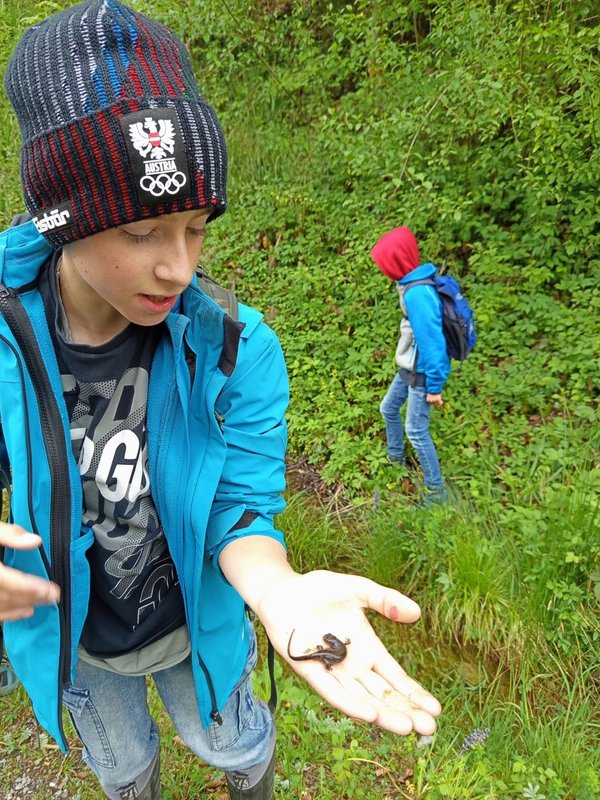 Letzten Dienstag startete der zweite Teil der Flussexkursion an der Bregenzerache mit dem Naturführer Martin Hotz. Trotz gedämpfter Temperaturen zeigten sich unglaublich viele Tiere. Neben Insekten wie die Eintagsfliegen- und Steinfliegenlarven gingen auch Unken und Molche ins Netz. Als kleine Baumeister zeigten die Naturdetektive auch ihr Talent bei der Erstellung von Furten, Klausen und Retentionsbecken.