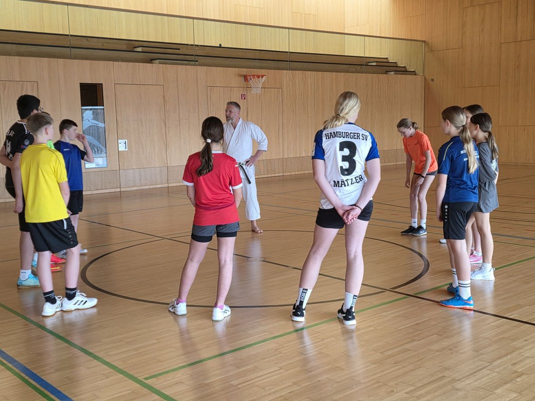 Unsere Schüler: innen waren mit vollem Einsatz dabei. Es wurde geschwitzt, gelacht und vor allem gestaunt, mit welcher Leichtigkeit Stefan komplexe Bewegungsabläufe erklärte. Eines ist sicher: Nach dieser Einheit fühlen sich alle ein Stückchen sicherer – und vielleicht auch ein bisschen wie junge Karate-Kids.